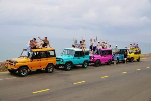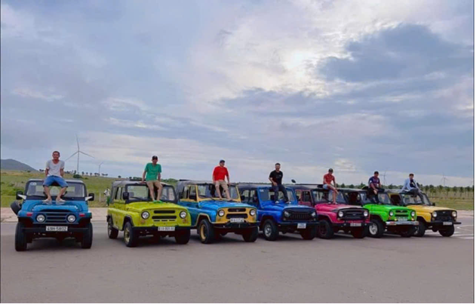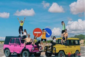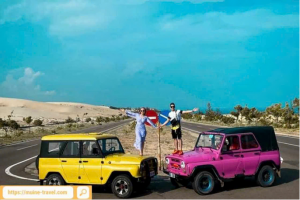 Du khách bên xe Jeep nhiều màu tại cánh đồng quạt gió Mũi Né. Không cần phải thuê, những trang phục của chính bạn sẽ tạo nên sự khác biệt!