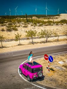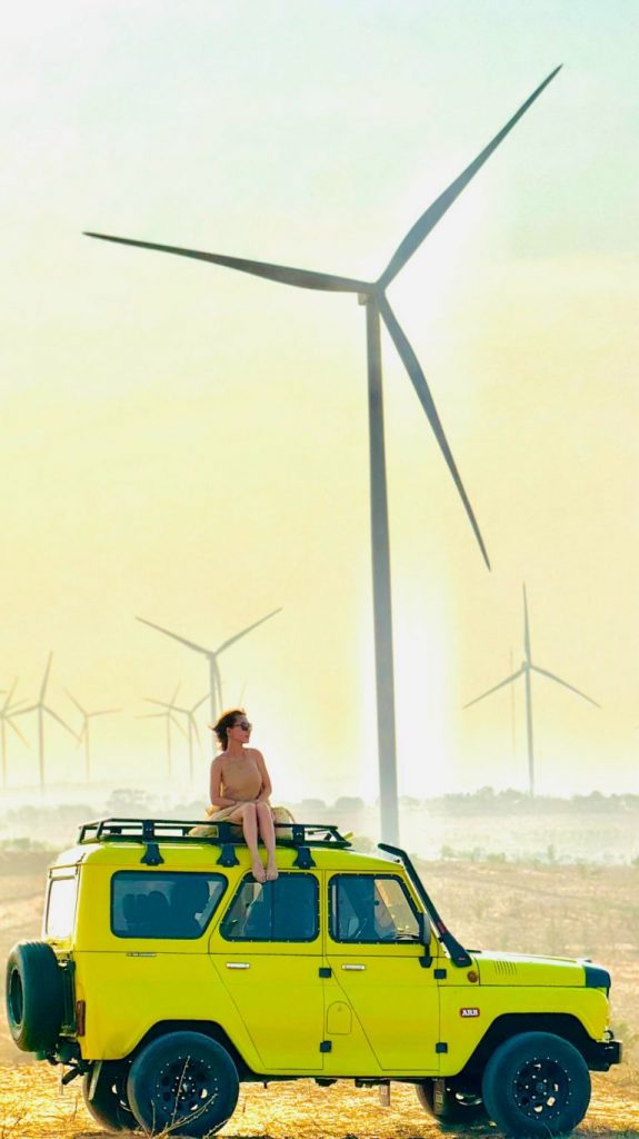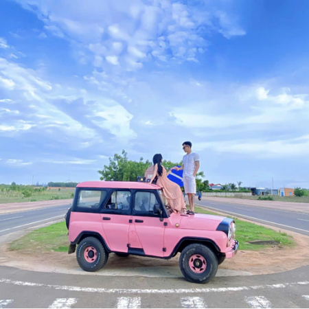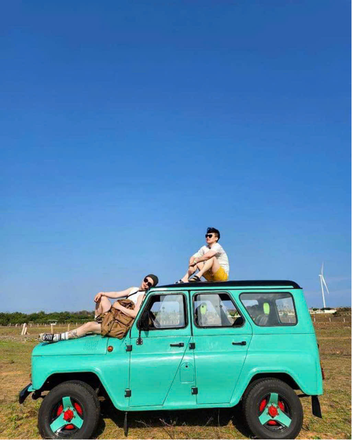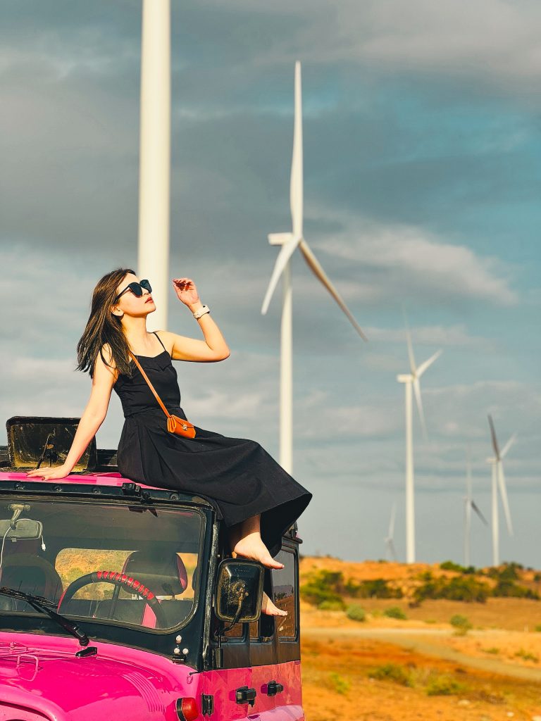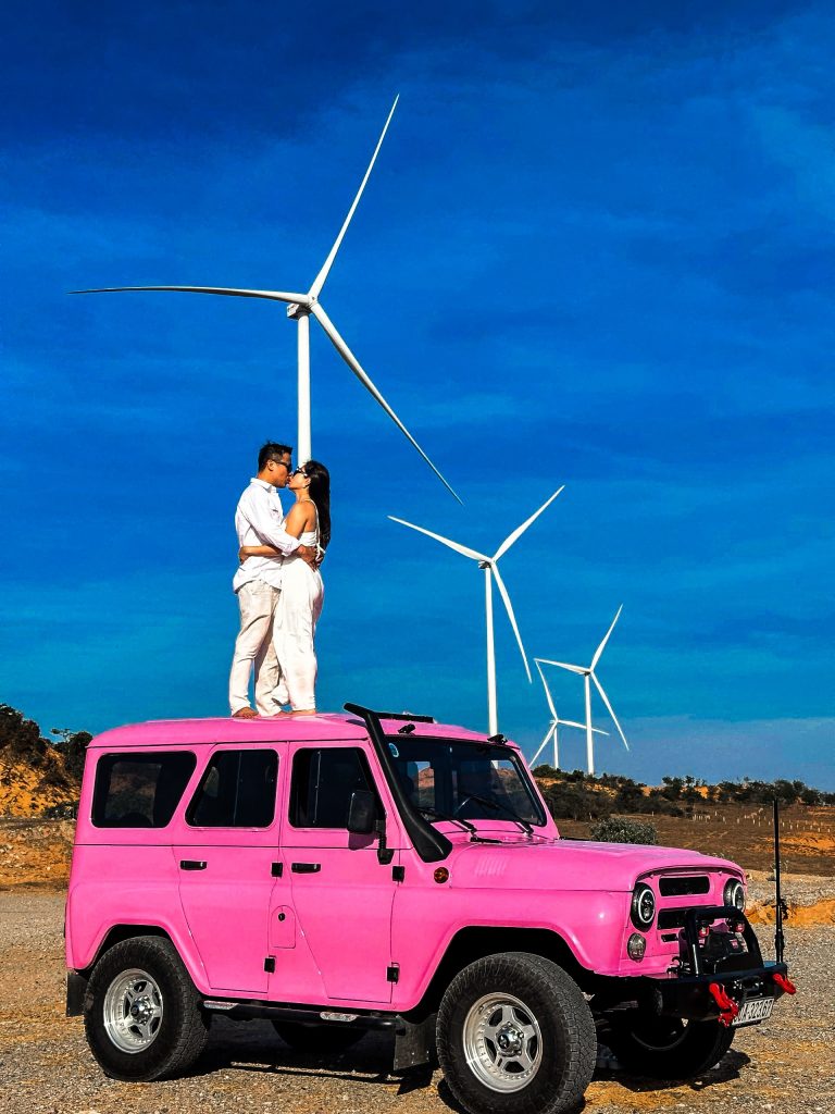 Địa điểm đầu tiên của tour, đến với cánh đồng quạt gió (Tubin gió). Một địa điểm chụp ảnh được rất nhiều khách trẻ yêu thích trong năm vừa qua. Xe Màu Vàng và Hồng luôn là 2 màu hot nhất được du khách lựa chọn chụp ảnh, tại đây. Rất nhiều góc chụp đẹp cùng với xe Jeep bên cạnh những chiếc Tubin gió khổng lồ cho quý khách những tấm ảnh thật đẹp.